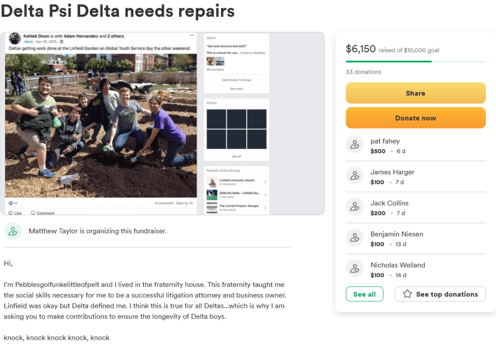 Howdy there, fellow Deltas, it’s *Dlbwck!* and Ben with a promised update on our Spring ‘23 Fundraiser and pledge class. A lot of work has happened in the past month, some of it deliberate, some of it by the seat of our *dlb*-ing pants, all of it with the goal of keeping the house comfy and cozy for the brothers and their newly pledged members (pledges, where?!?). *Dlbwck!*